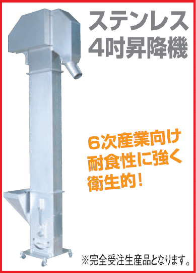 食品工場等の農業以外の用途でもご利用いただけるようステンレス製の昇降機を開発いたしました。